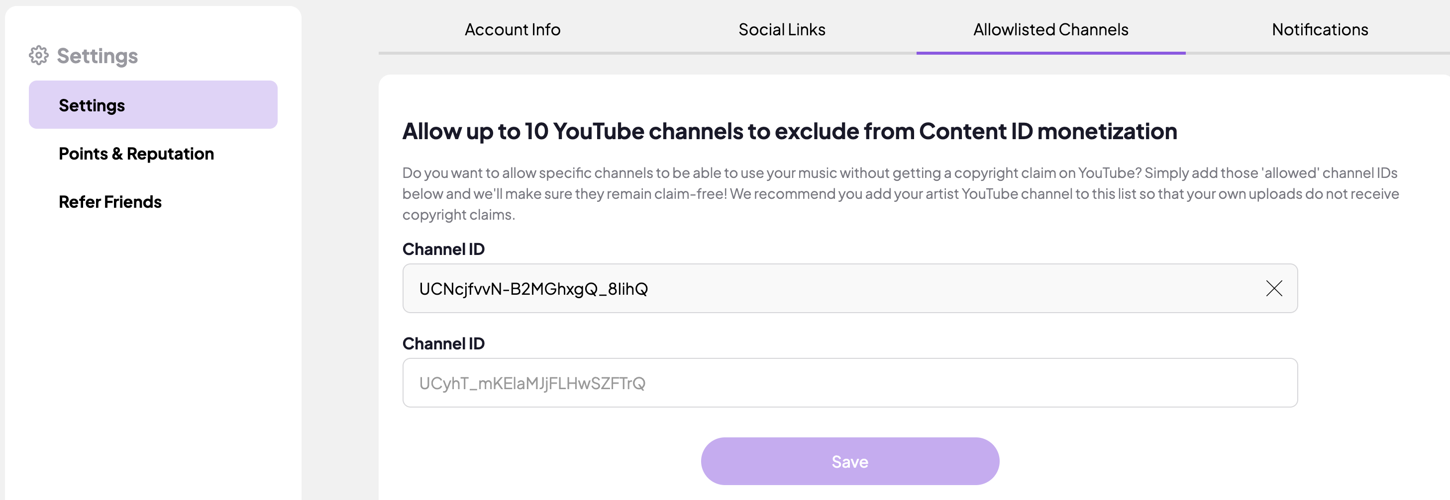 Simply add their channel IDs to the Allowlisted Channels tab in your Settings. This whitelist ensures those channels can use your music claim-free on YouTube.