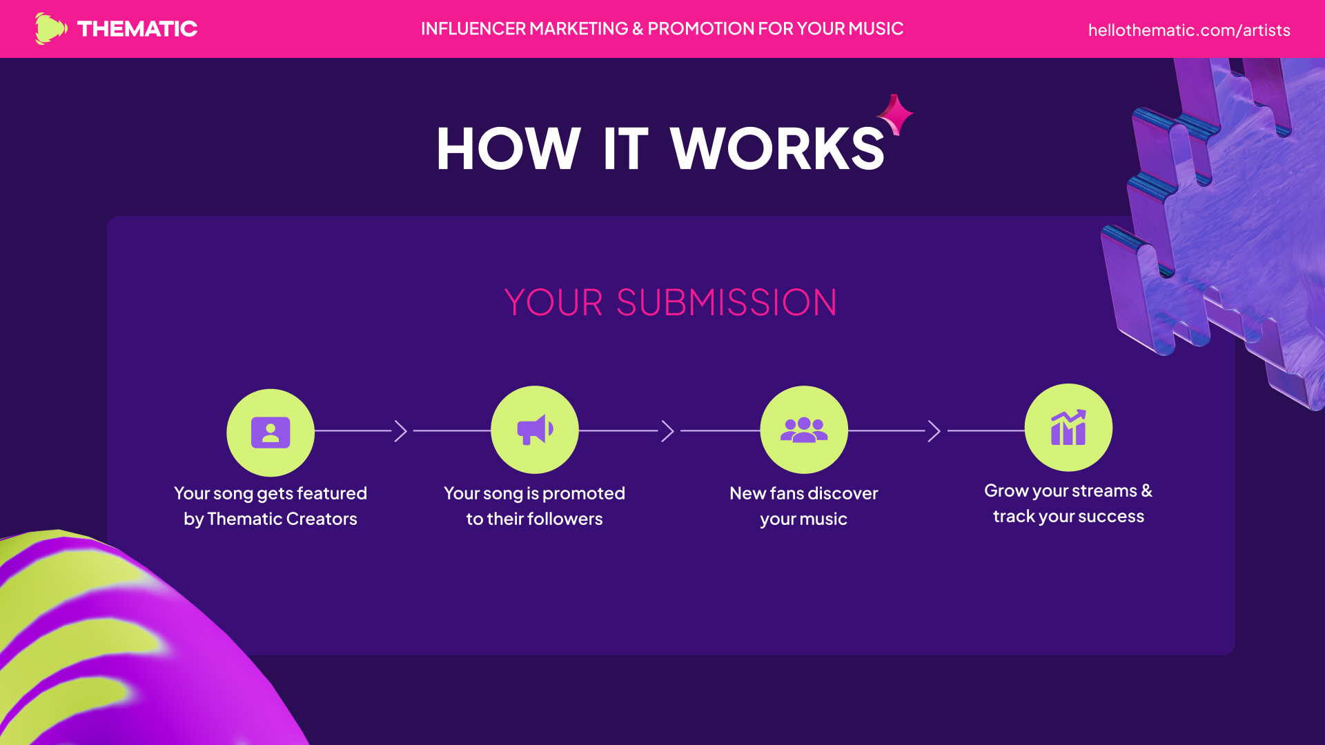 Whether you're building buzz for a new release or keeping your back catalog active, Thematic makes it easy to get your music discovered - at no cost to you.