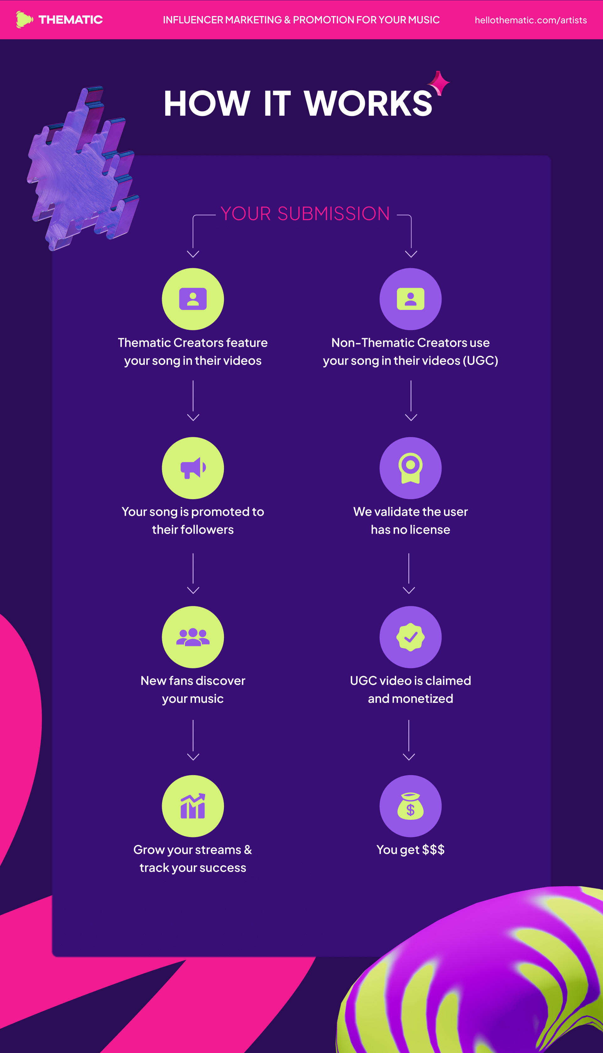 When non-licensed users post videos with your music, Thematic claims and monetizes those videos on your behalf.