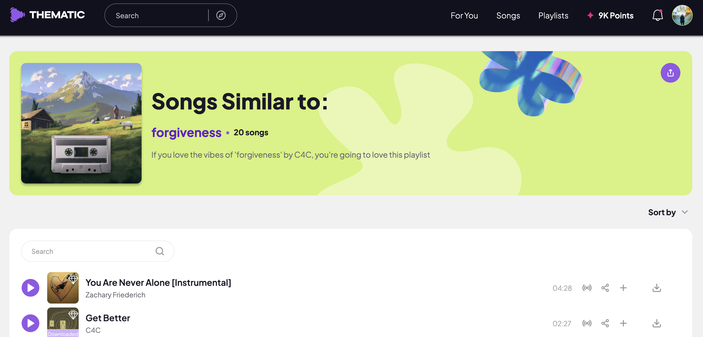 When you open a Similar Song page, Thematic surfaces tracks that align with the original song’s: