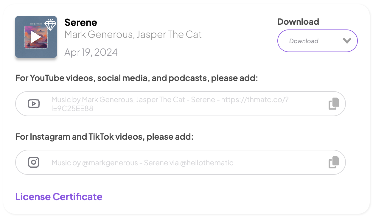 THEMATIC LICENSE CERTIFICATE – This document provides proof of my license for the song “SONG TITLE” by ARTIST NAME for my content: LINK TO YOUR LICENSE CERTIFICATE