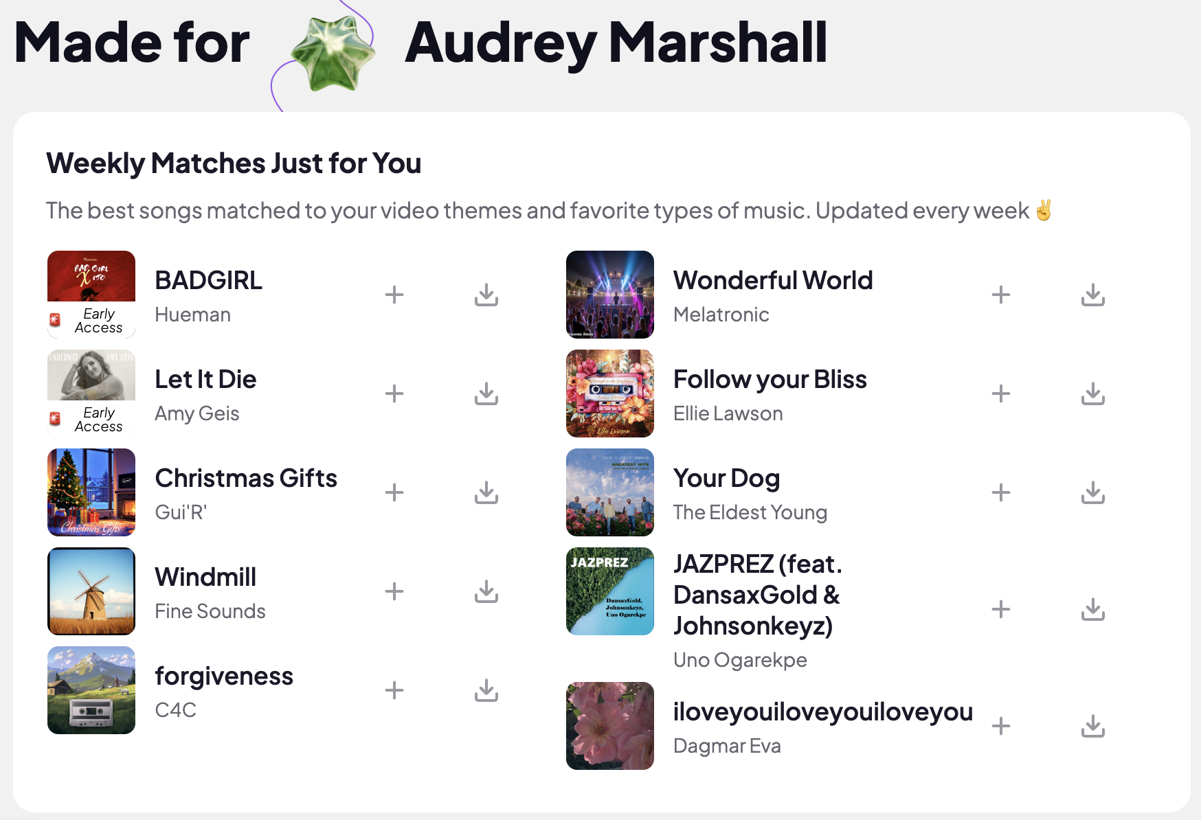 Weekly Matches are personalized song recommendations curated just for you based on the types of videos you create and your favorite music genres.