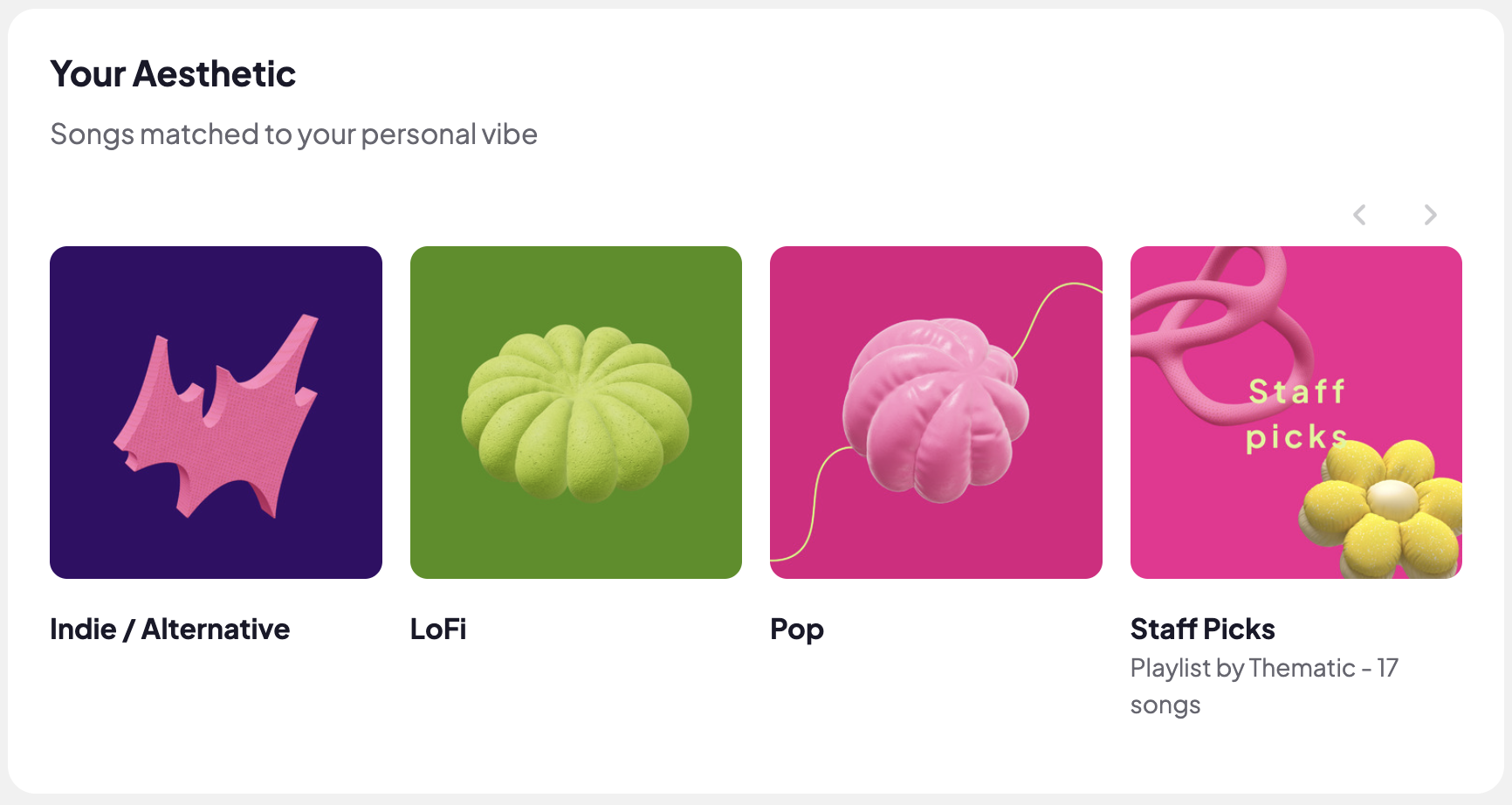 Songs matched to your personal vibe. Explore your favorite genres, styles, and Staff Picks curated by the Thematic team.