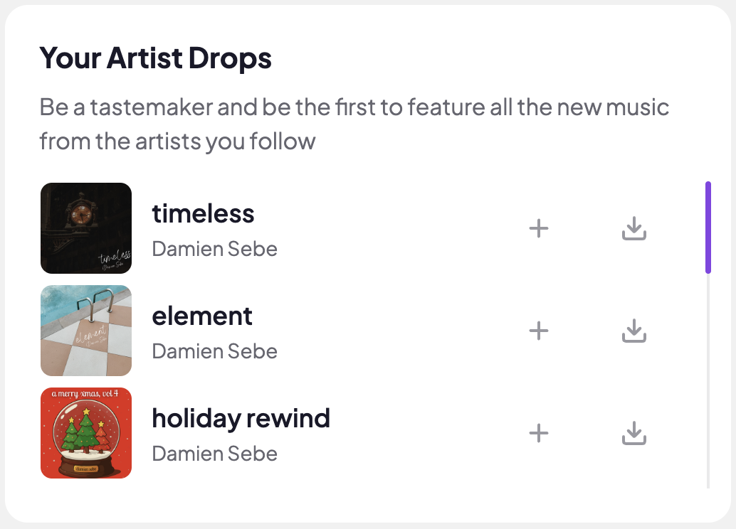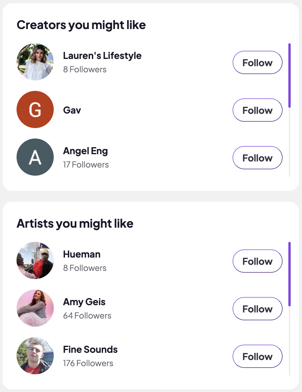 Find new creators and artists to follow based on your music taste, shared interests, and activity.