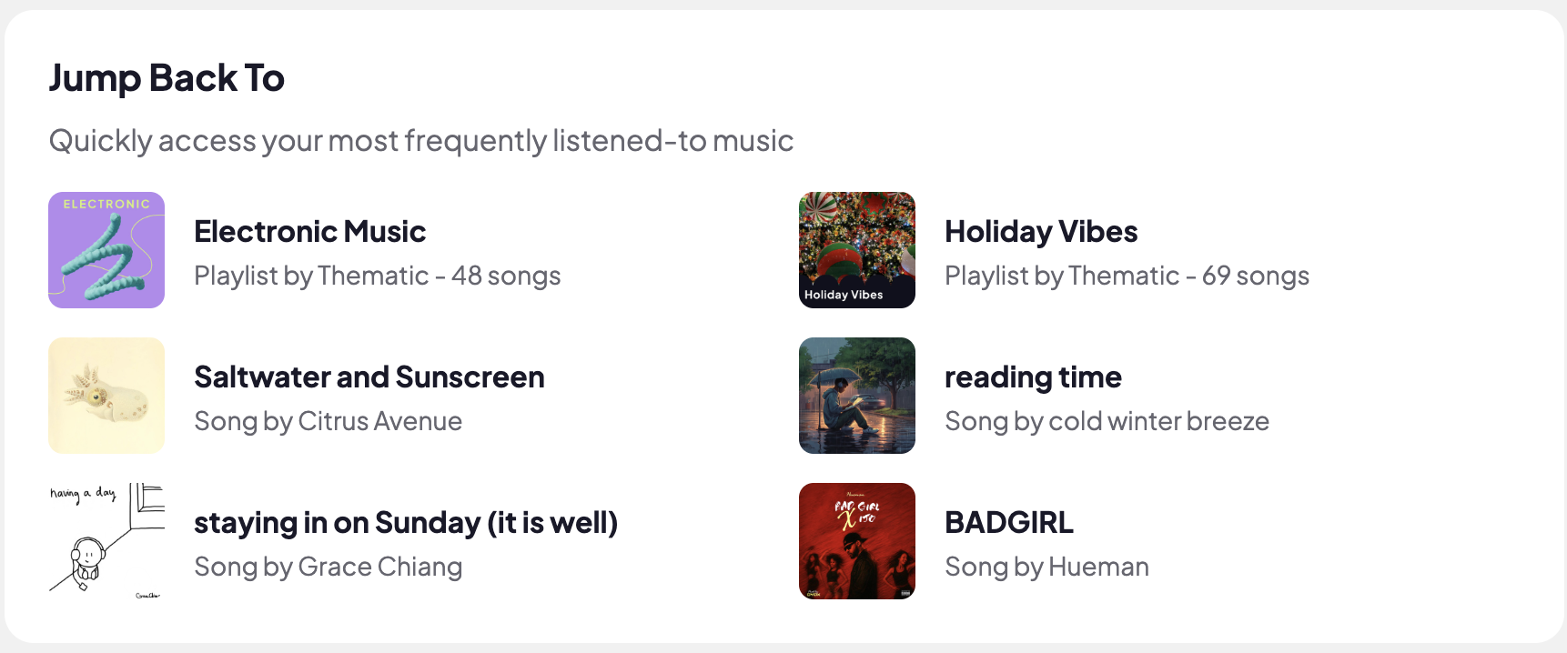 Quickly return to the music you interact with most. This includes recently viewed songs, playlists, and other pages you’ve explored - perfect for picking up where you left off.