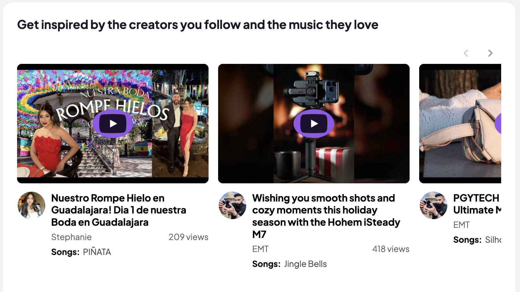 Get inspired by the creators you follow on Thematic. See their videos and the songs they’re using to spark new ideas and discover trending tracks.