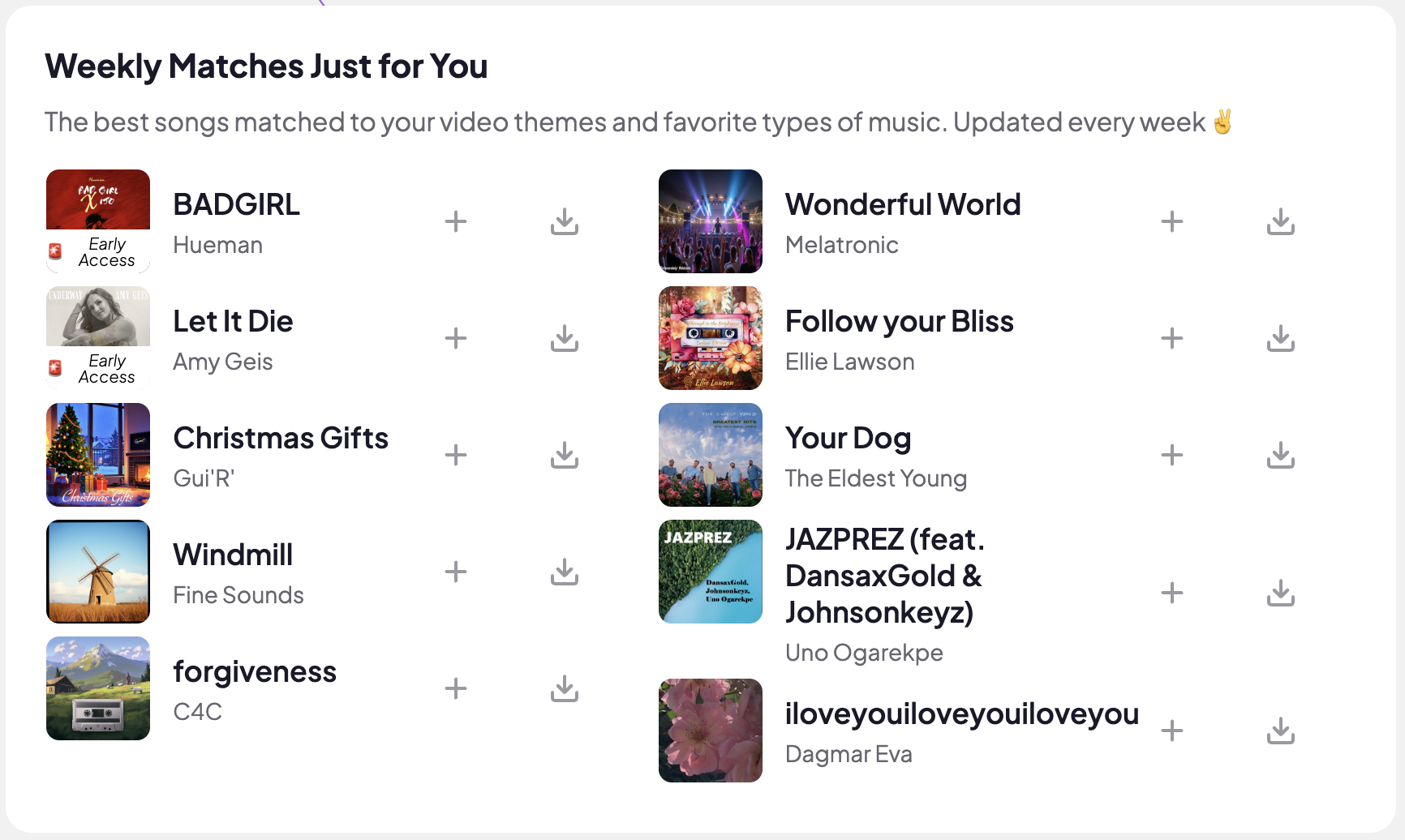 The best songs matched to your video themes and favorite types of music - updated every week ✌️Check back every week for fresh tracks that align with your content style.